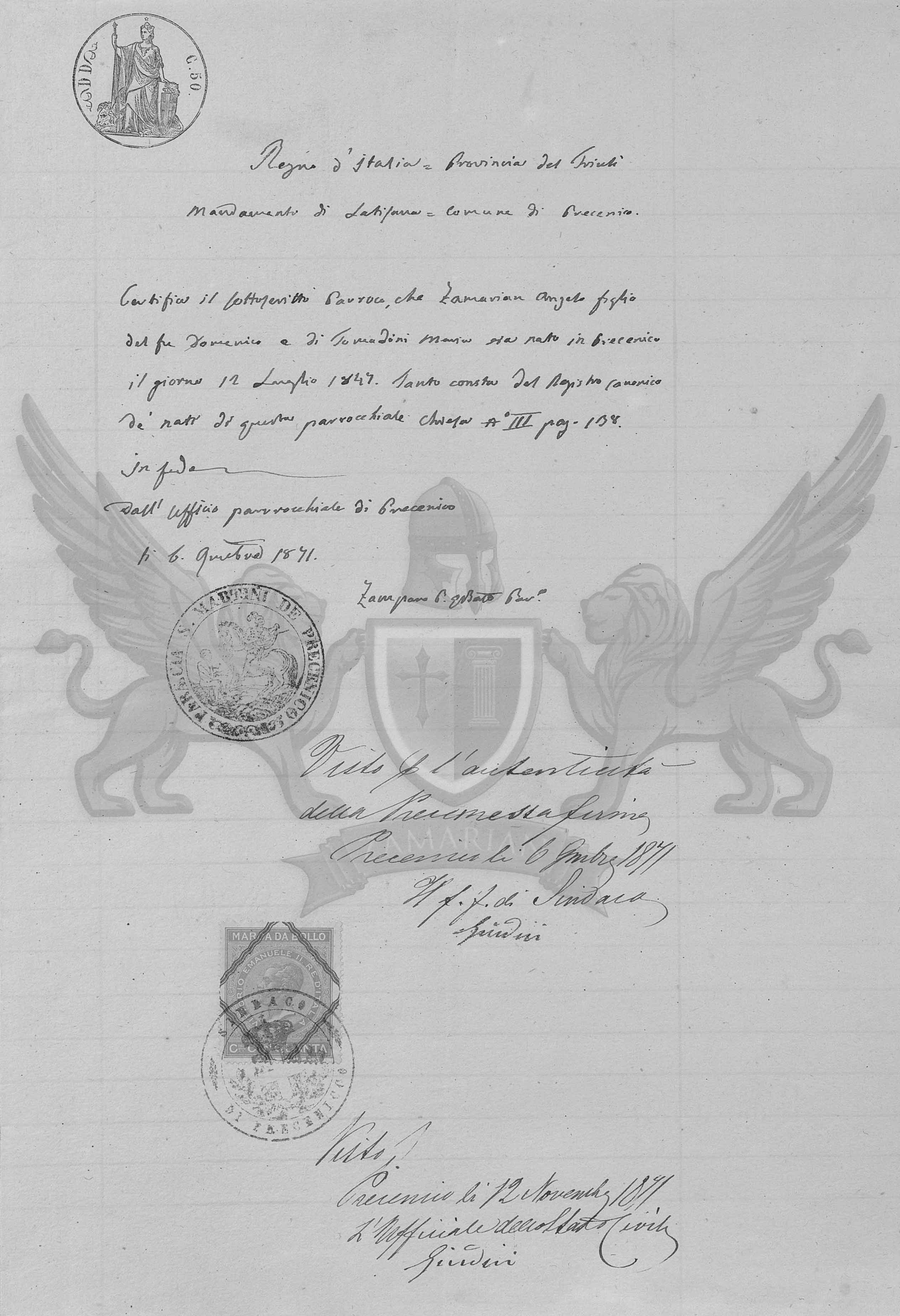 Certifica o subscrito Pároco, que Zamarian Angelo filho do finado Domenico e de Tomadini Maria tenha nascido em Precenicco no dia 12 de Julho de 1847. Tanto consta do Registro canonico de nascimentos desta paroquial Igreja nº III página 138.