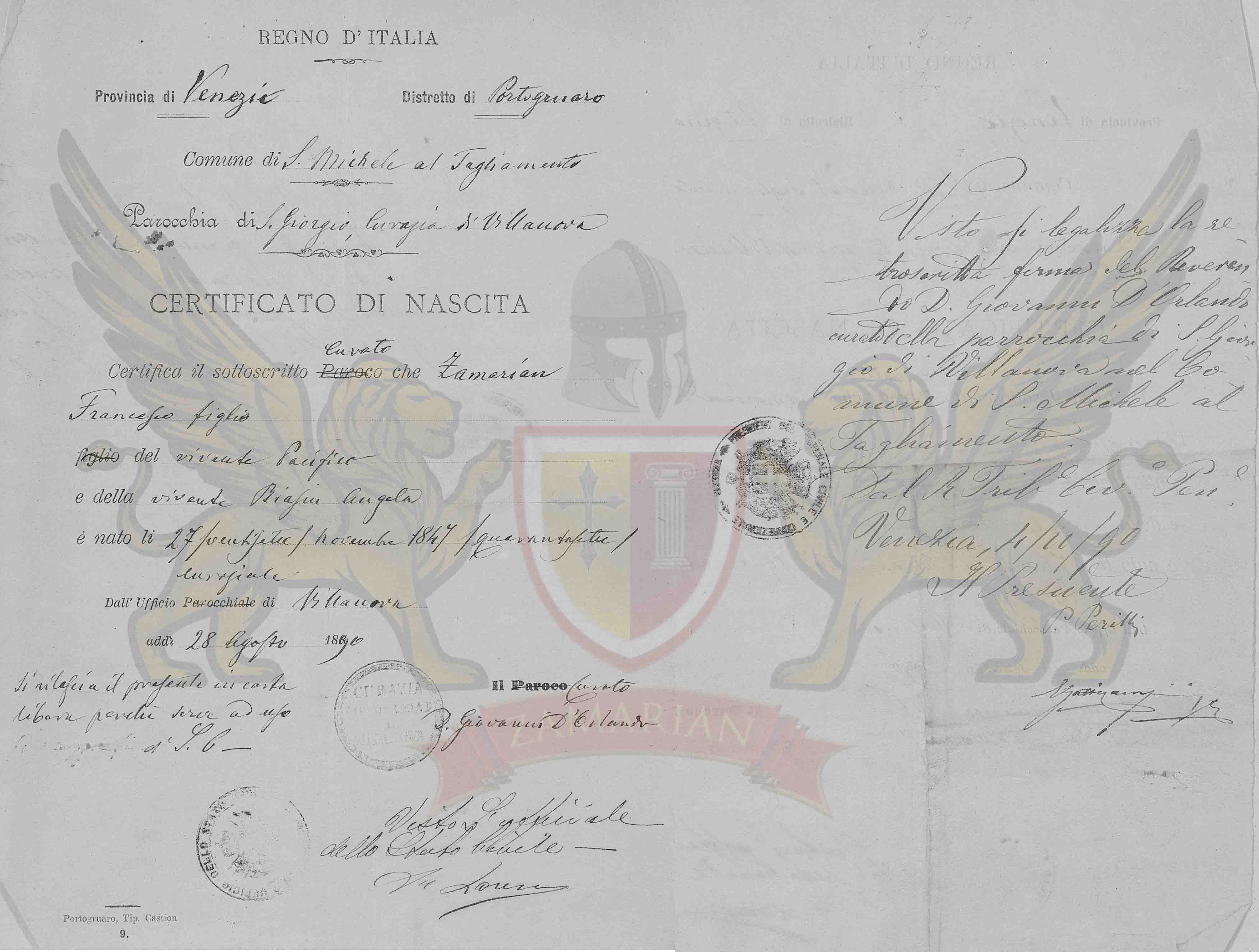 Certifica o subscrito curador que Zamarian Francesco filho do vivente Francesco e da vivente Biasin Angela nasceu dia 27 /vinte e sete/ de novembro de 1847 /mil oitocentos e quarenta e sete/.