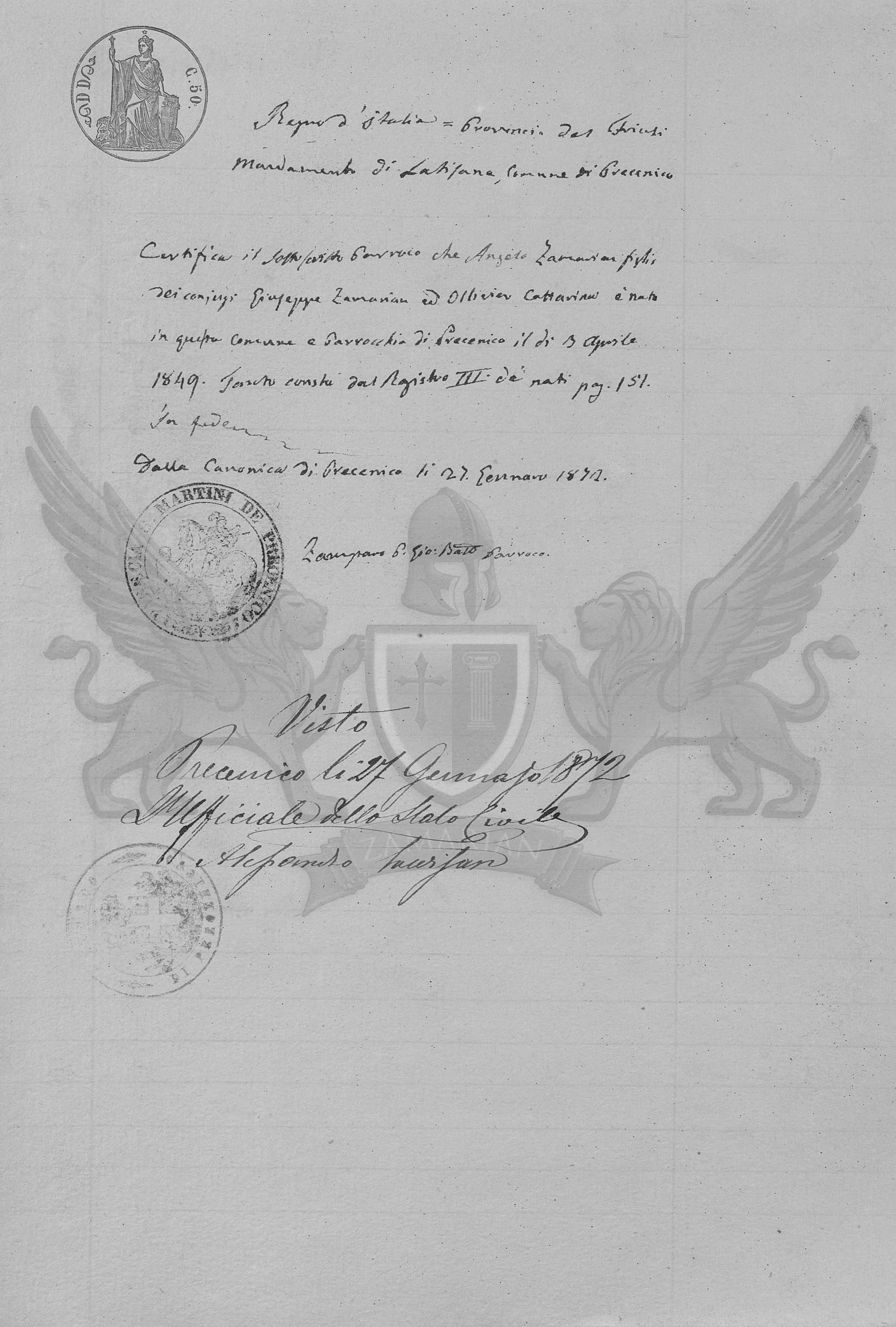 Certifica o subscrito Pároco que Angelo Zamarian filho dos cônjuges Giuseppe Zamarian e Olivier Cattarina nasceu neste Município e Paróquia de Precenicco no dia 3 de Abril de 1849. Tanto consta do Registro III dos nascimentos página 151.