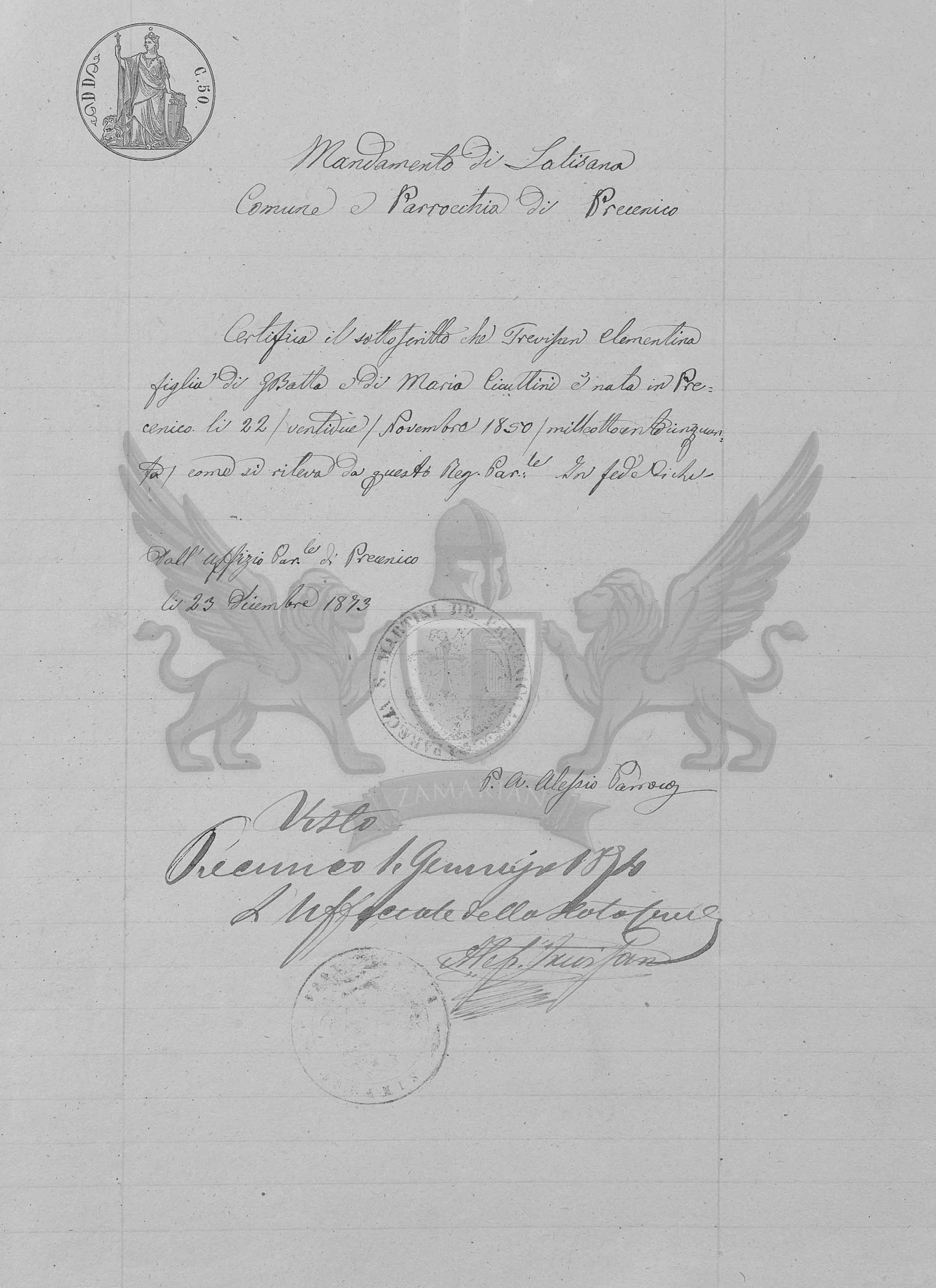Certifica o subscrito que Trevisan Clementina filha de Giovanni Battista e de Maria Cicuttini nasceu no dia 22/ vinte e dois/ de Novembro de 1850 /mil oitocentos e cinquenta/ como revela este Registro Paroquial em fé de que