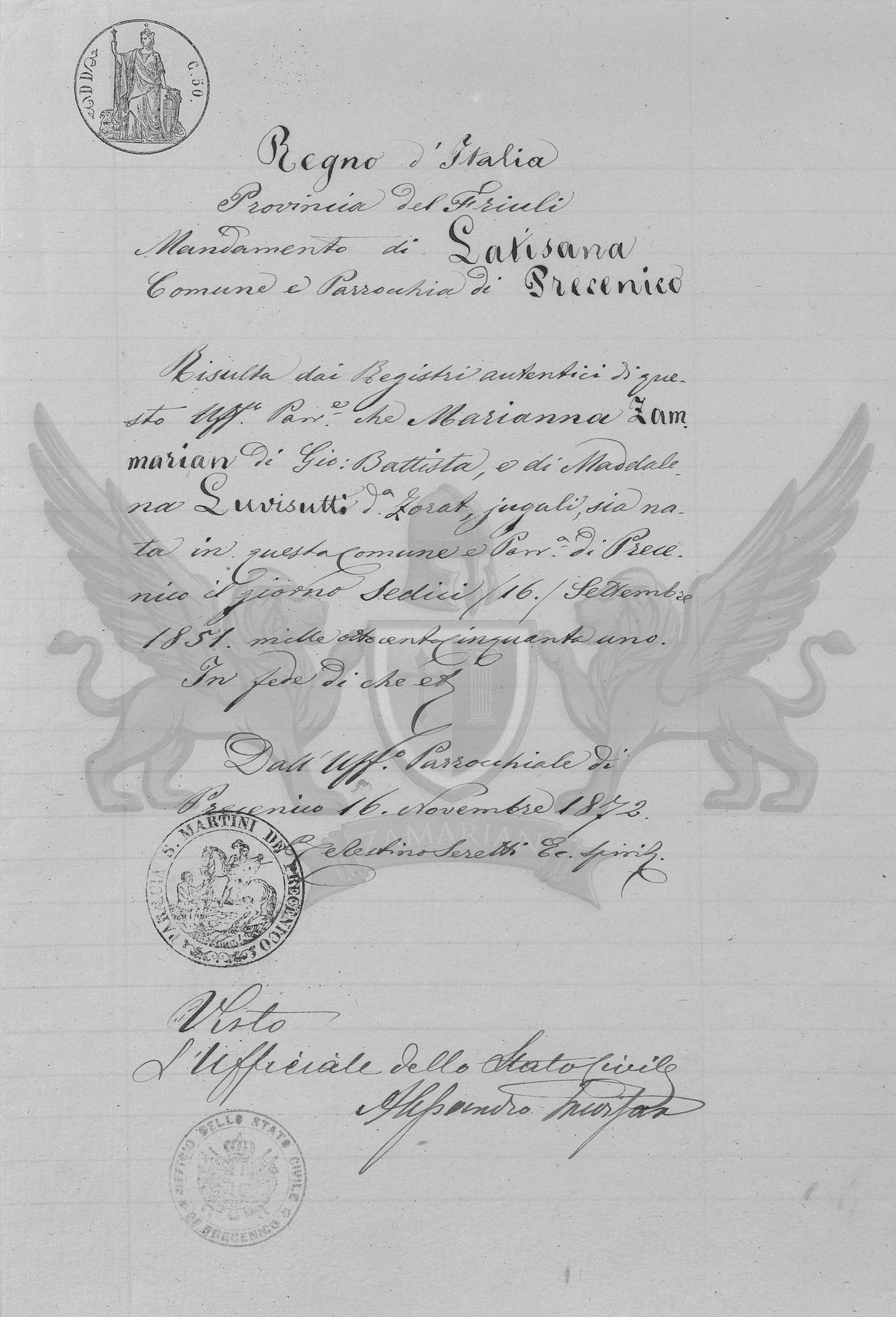 Resulta dos Registros autênticos deste Ofício Paroquial que Marianna Zamarian filha de Giovanni Battista e de Maddalena Luvizutti conhecida Zorat, da mesma forma, tenha nascido neste Município e Paróquia de Precenicco no dia dezesseis /16/ de Setembro de 1851 mil oitocentos e cinquenta e um.