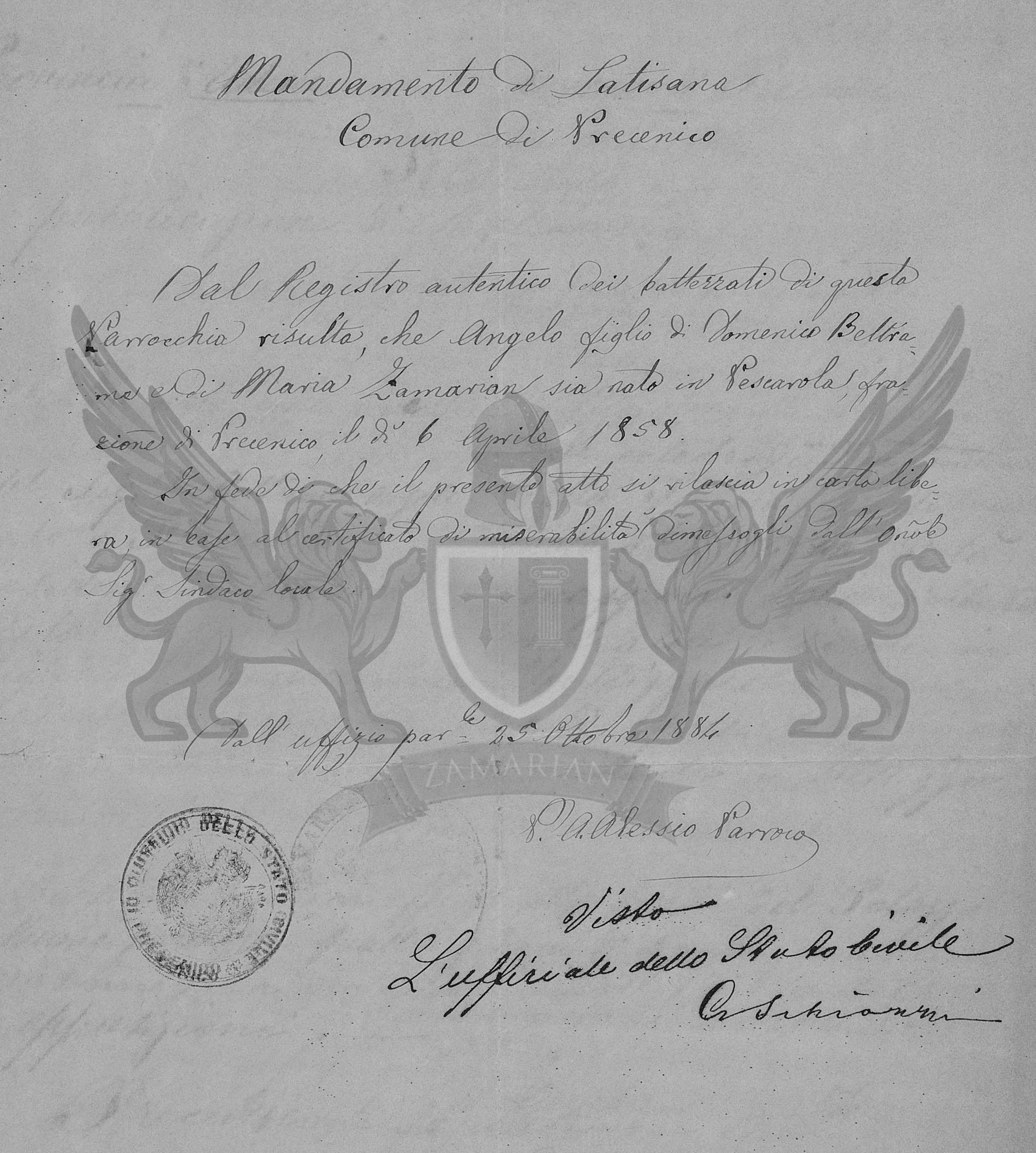 Do Registro autêntico dos batizados desta Paróquia resulta, que Angelo filho de Domenico Beltrame e de Zamarian Maria nasceu em Pescarola, fração de Precenicco, no dia 6 de Abril de 1858.