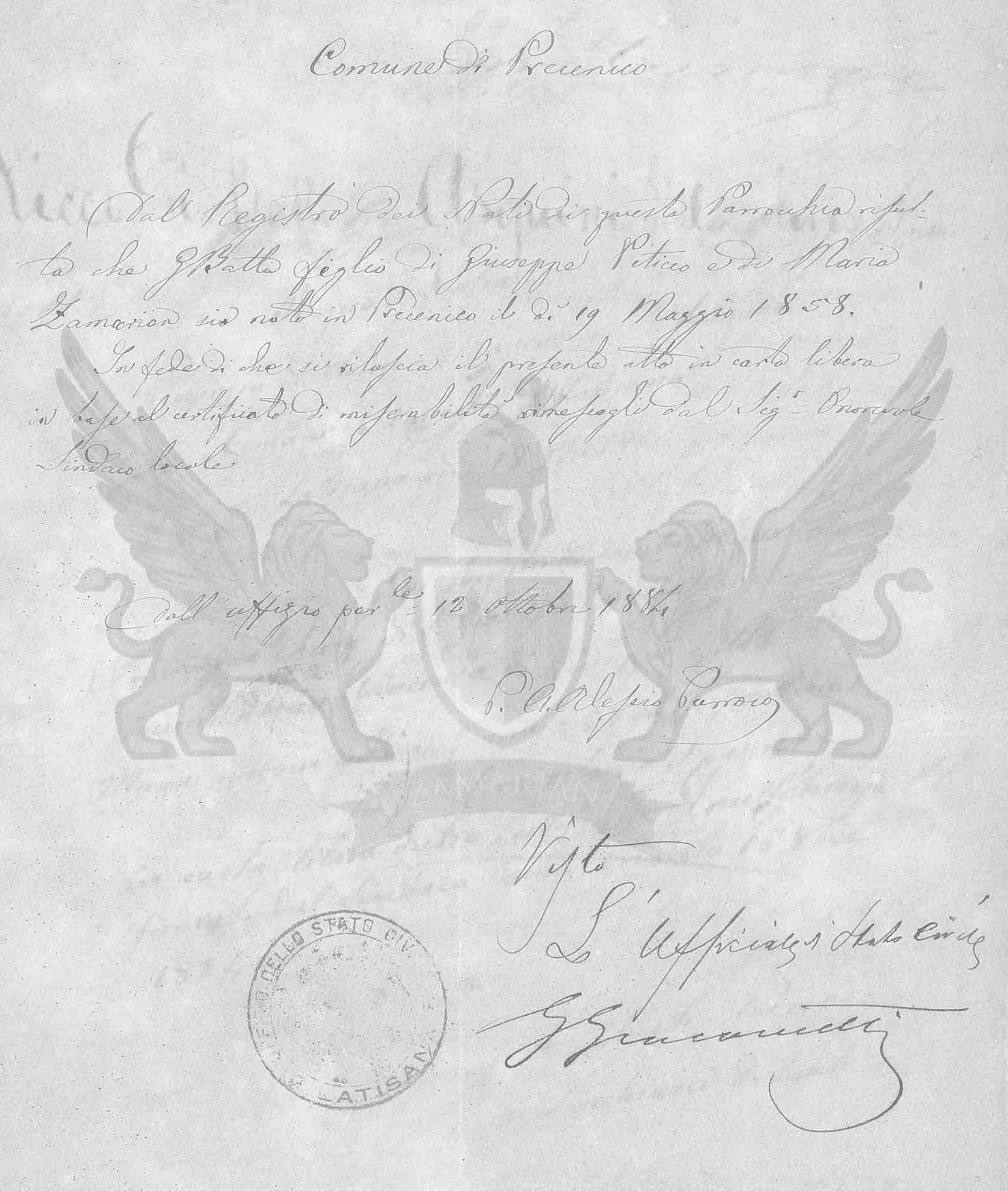 Do registro dos Nascidos desta Paróquia resulta que Giovanni Battista filho de Giuseppe Piticco e de Maria Zamarian seja nascido em Precenicco no dia 19 de maio de 1858.