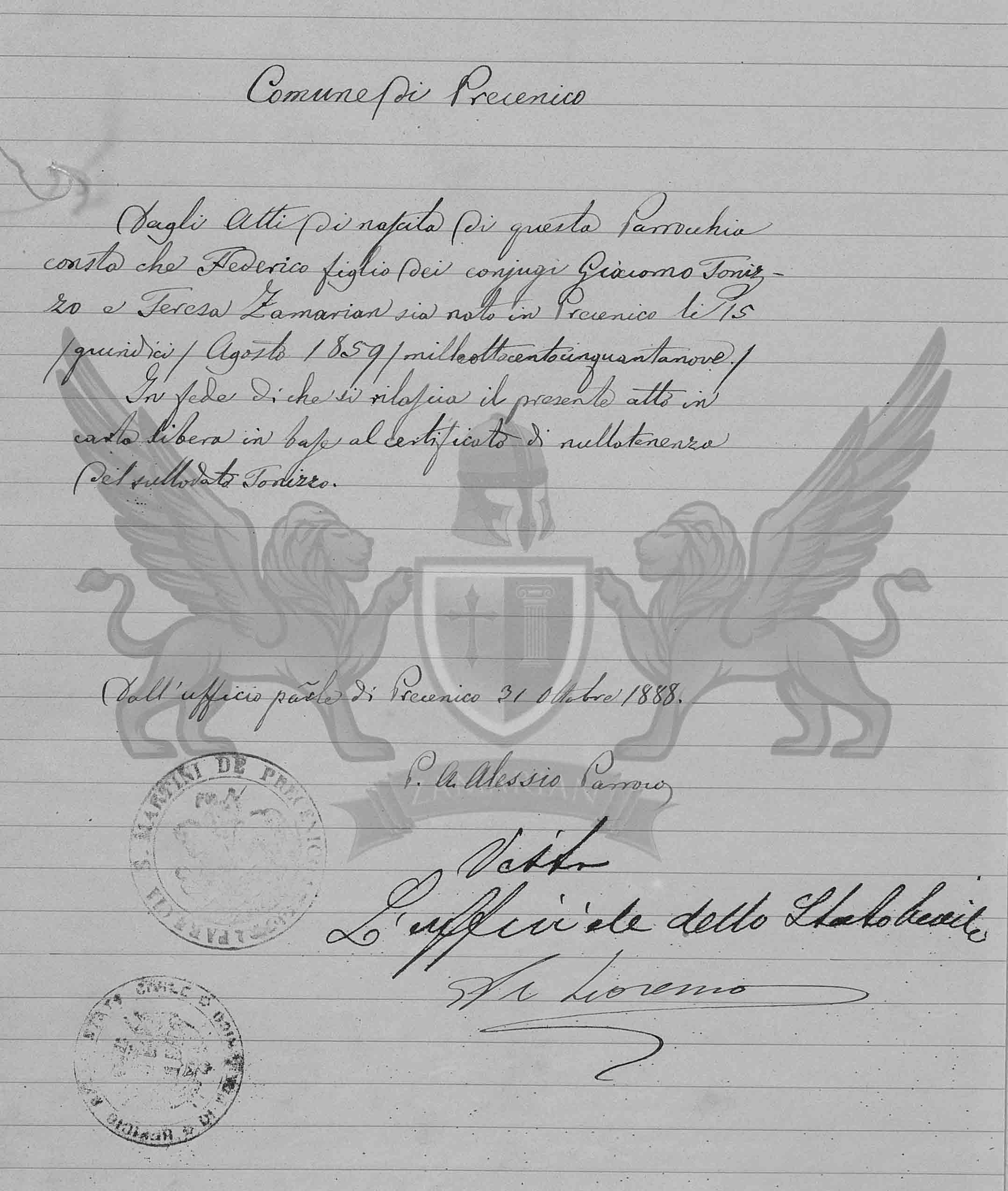 Dos Atos de nascimento desta Paróquia consta que Federico filho dos cônjuges Giacomo Tonizzo e Teresa Zamarian seja nascido em Precenicco dia 15 /quinze/ de Agosto de 1859 /mil oitocentos e cinquenta e nove/.