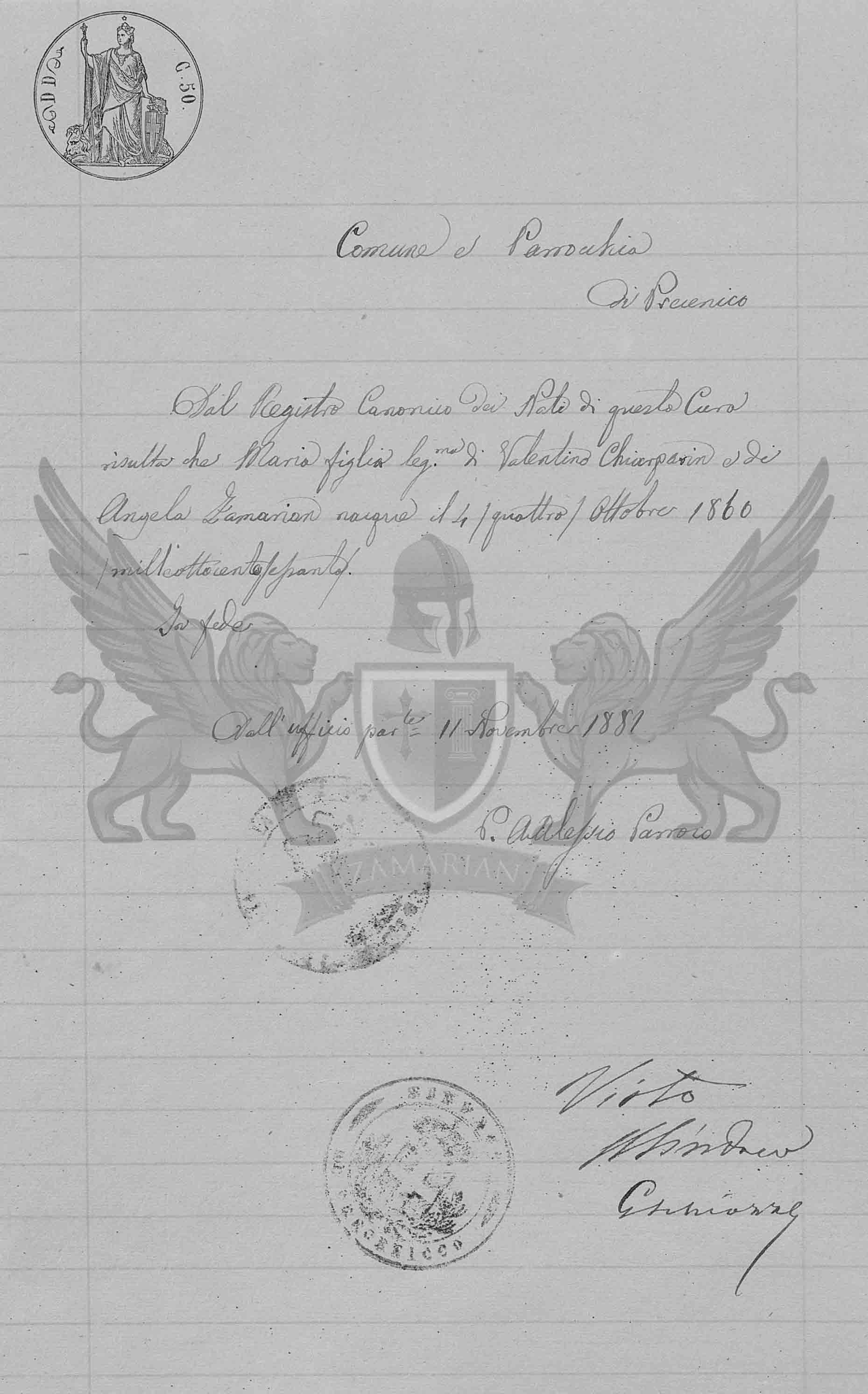 Do Registro Canônico dos Nascimentos desta Curia resulta que Maria filha legítima de Valentino Chiarparin e de Angela Zamarian nasce dia 4 /quatro / de Outubro de 1860 /mil oitocentos e sessenta/. In fede