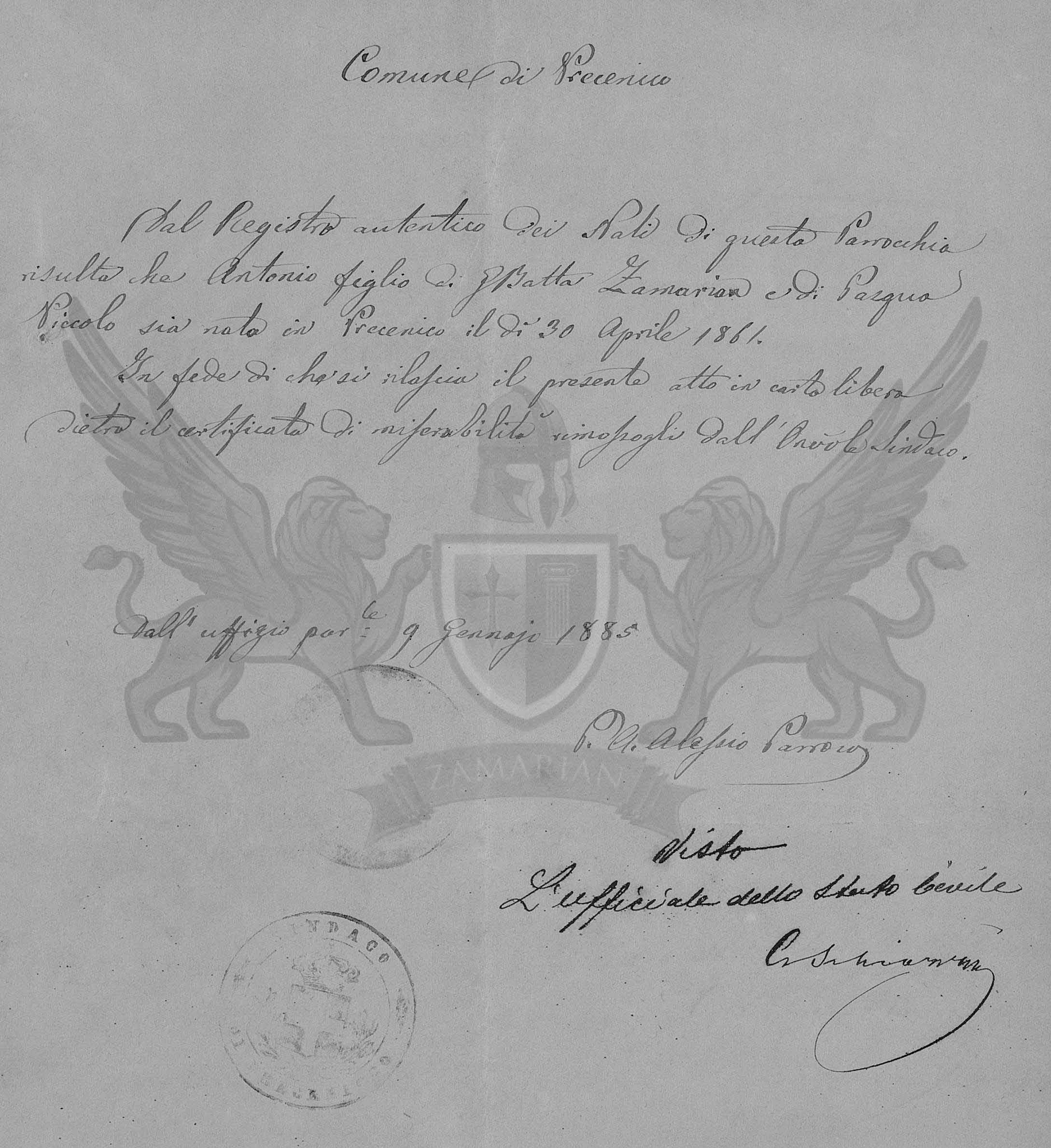 Do Registro autêntico dos Nascidos desta Paróquia resulta que Antonio filho de Giovanni Battista Zamarian e de Pasqua Piccolo seja nascido em Precenicco no dia 20 de Abril de 1861.
