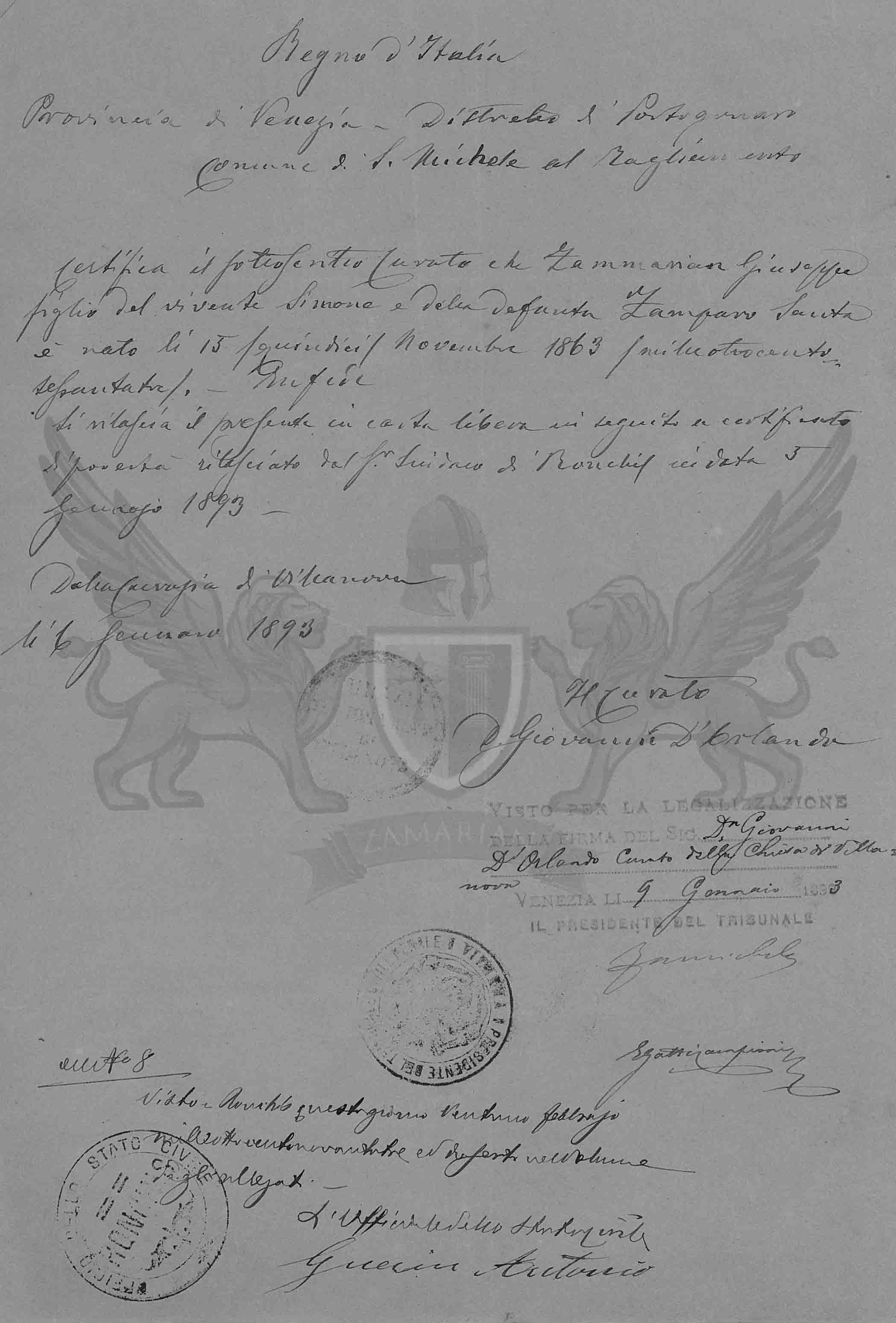 Se emite o presente em papel livre de acordo com o certificado de pobreza emitido pelo Senho Síndico de Ronchis em data de 5 de janeiro de 1893.