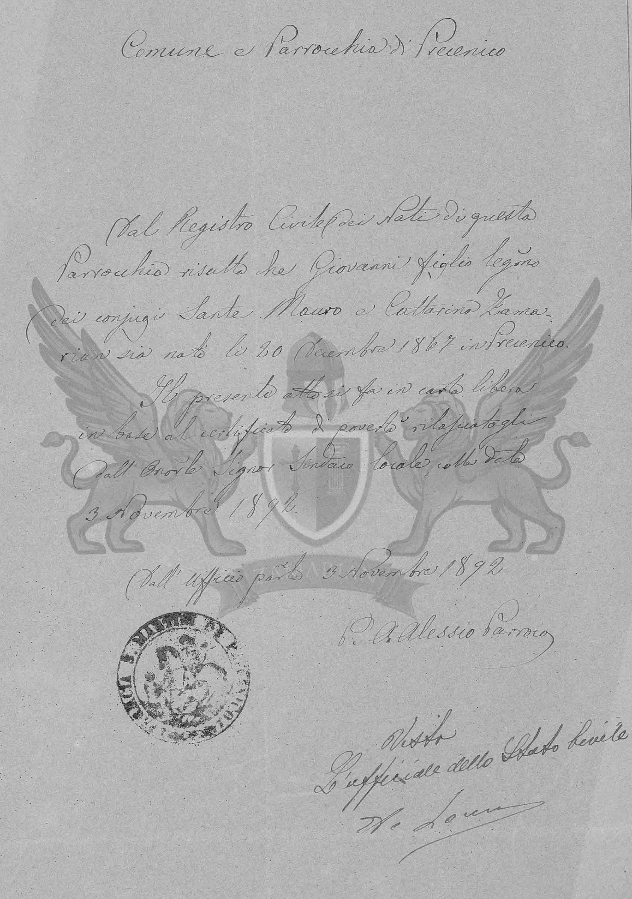 Do Registro Civil dos Nascidos desta Paróquia resulta que Giovanni filho legítimo dos cônjuges Sante Mauro e Cattarina Zamarian seja nascido dia 20 de Dezembro de 1867 em Precenicco.