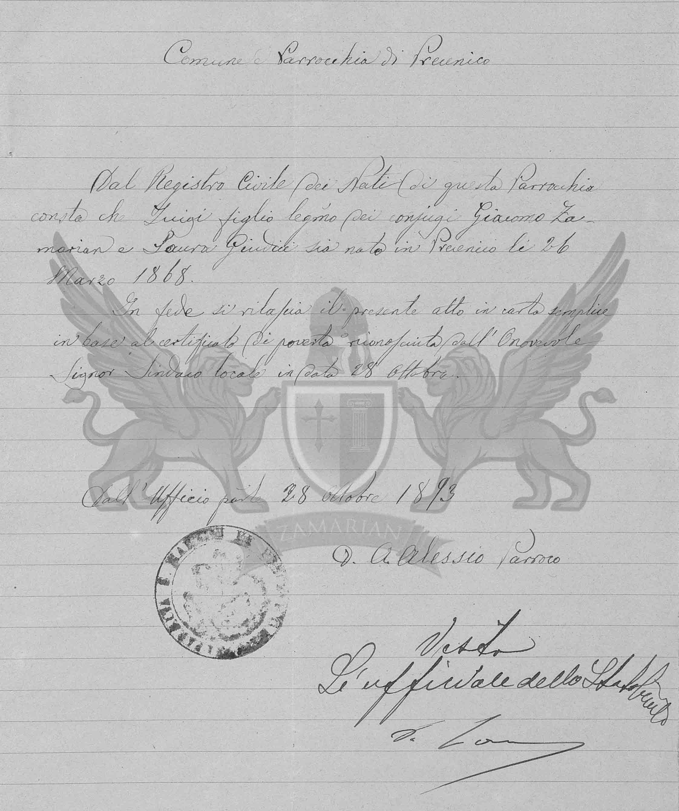 Do Registro Civil dos Nascidos desta Paróquia consta que Luigi filho legítimo dos cônjuges Giacomo Zamarian e Laura Giudici seja nascido em Precenicco dia 26 de Março de 1868.