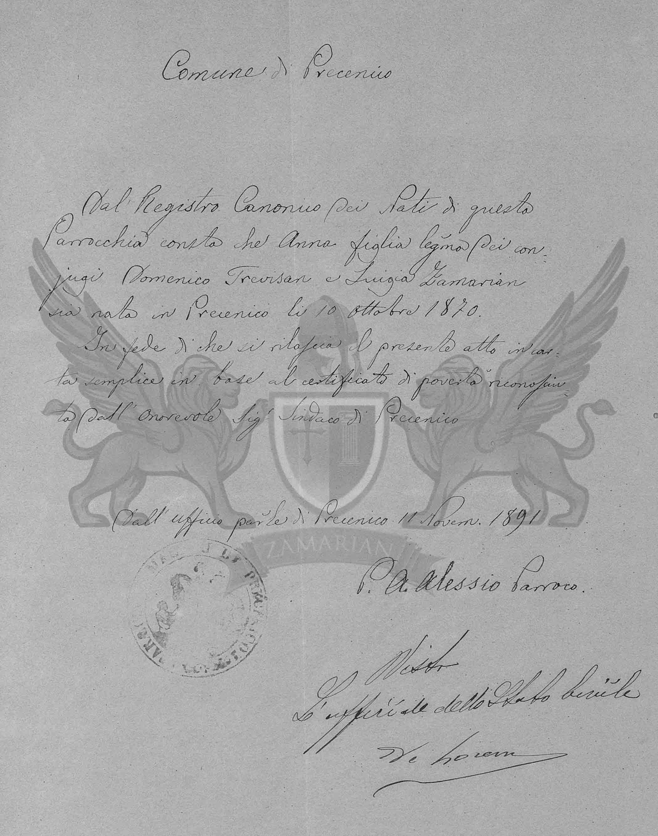 Do Ofício paroquial de Precenicco 11 de Novembro de 1891