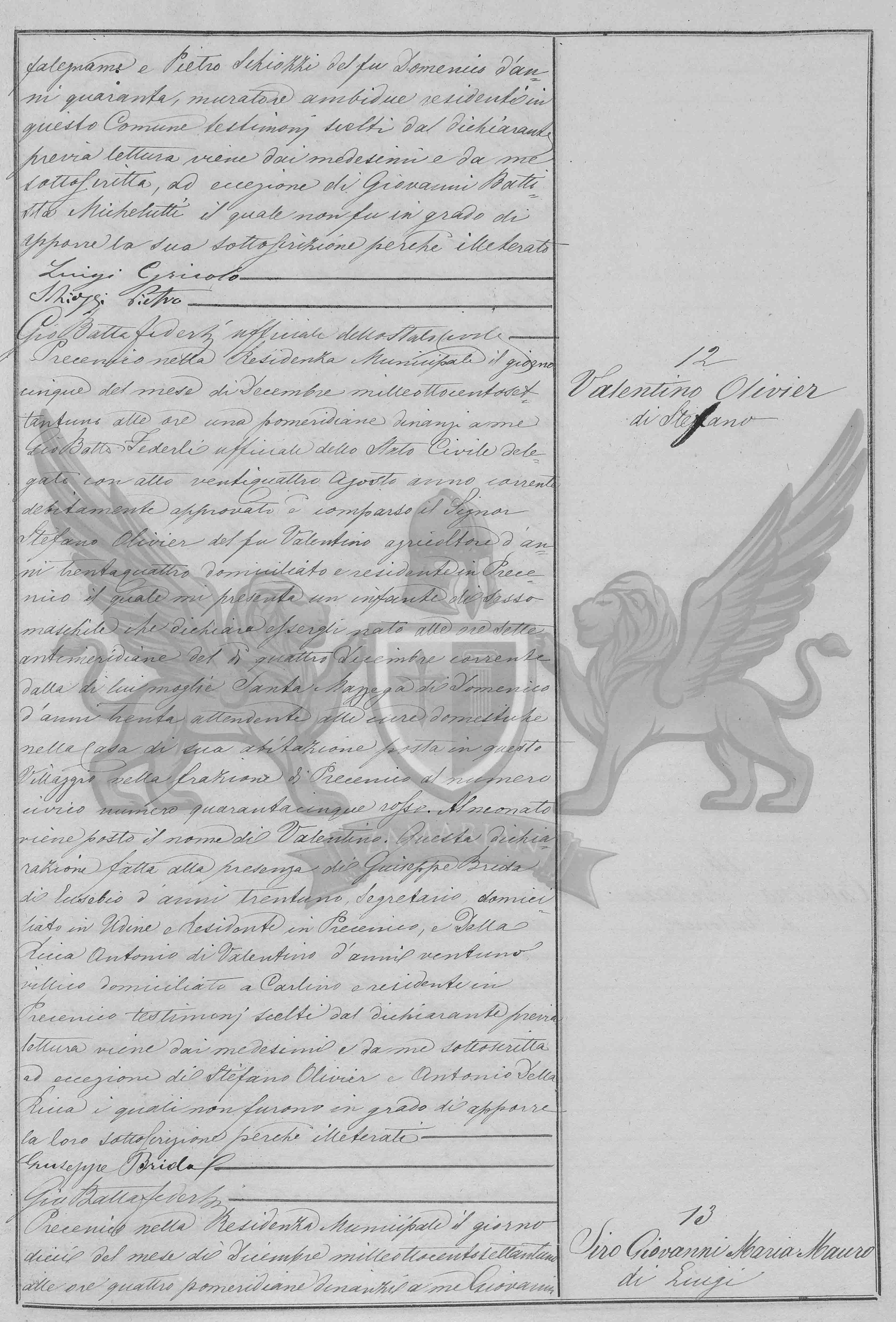 Gio Batta Federli o Oficial do Estado Civil de Precenicco na residência Municipal no dia cinco do mês de Dezembro de mil oitocentos e setenta e um às treze horas pós meridianas diante de mim Gio Batta Federli oficial do Estado Civil delegado com ato dia vinte e quatro de Agosto do ano corrente devidamente aprovado compareceu o Senhor Stefano Olivier filho do falecido Valentino agricultor de trinta e quatro anos domiciliado e residente em Precenicco o qual me apresenta um infante de sexo masculino que declara de ter nascido às sete horas ante meridianas do dia quatro de dezembro corrente de sua mulher Santa Mazzega filha de Domenico de trinta anos atendente aos cuidados domésticos na Casa de sua habitação situada neste Vilarejo na fração de Precenicco ao civico número quarenta e cinco vermelho.