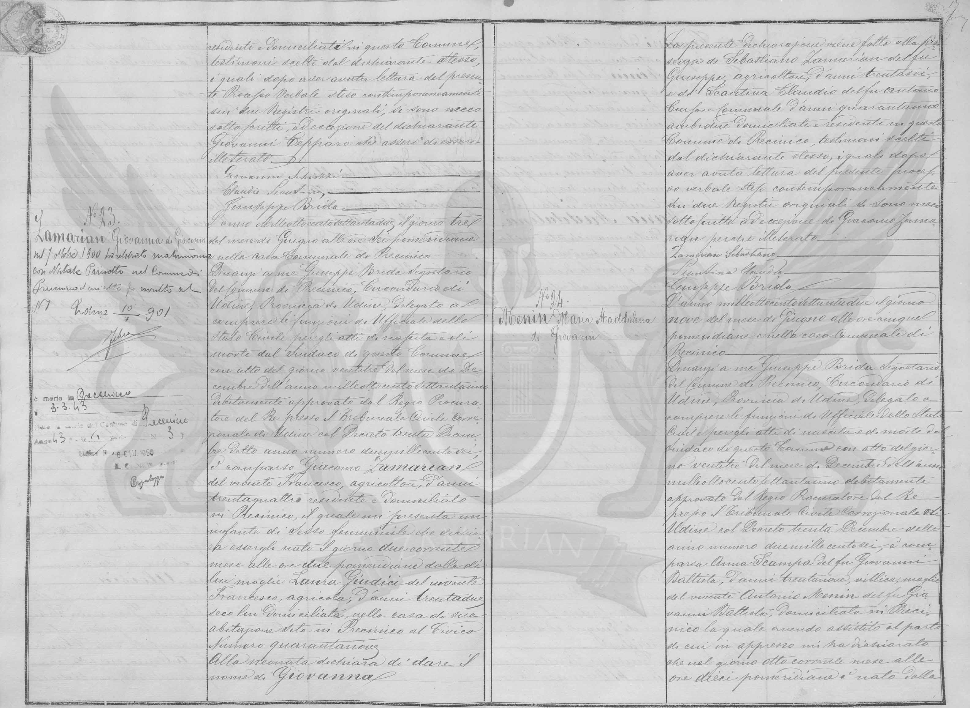 Diante de mim Giuseppe Brida Secretário do Município de Precenicco, Circundário e Província de Udine, delegado e a cumprir as funções de Oficial do Estado Civil pelos atos de nascimento e falecimento do Síndico deste Município com ato do dia vinte e três do mês de Dezembro do ano de mil oitocentos e setenta e um, aprovado pelo Procurador do Rei junto ao Tribunal Civil Correcional de Udine com Decreto dia trinta de Dezembro do citado ano número dois mil cento e seis, compareceu: Giacomo Zamarian filho do vivente Francesco, agricultor, de trinta e quatro anos residente e domiciliado em Precenicco, o qual me apresenta um infante de sexo feminino que declara ser nascido no dia dois do corrente mês às duas horas pós meridianas dele e de sua mulher Laura Giudici filha do vivente Francesco, agricultora, de trinta e dois anos, com ele domiciliada, na casa de habitação situada em Precenicco ao cívico número quarenta e nove.