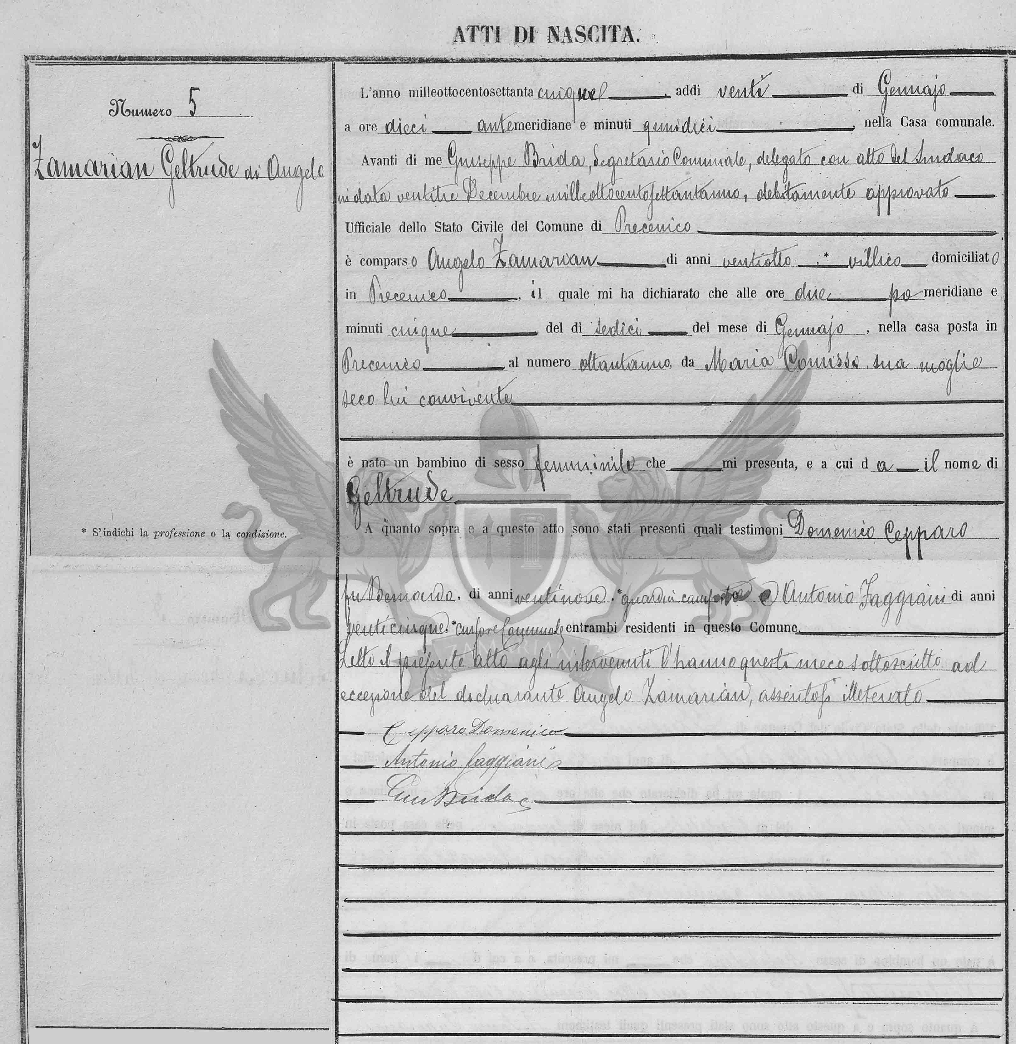Diante de mim Giuseppe Brida secretário, delegado pelo Síndico com ato vinte e três de dezembro de mil oitocentos e oitenta e um devidamente aprovado Oficial do Registro Civil do Município de Precenicco, compareceu Zamarian Angelo, de vinte e oito anos, camponês, domiciliado em Precenicco, a qual me declarou que às duas horas da tarde, do dia dezesseis do mês de janeiro, na casa situada em Precenicco ao número oitenta e um, de Comisso Maria, camponesa, sua mulher, com ele convivente nasceu uma criança de sexo feminino que ele me apresenta, e a qual dá o nome de Geltrude.