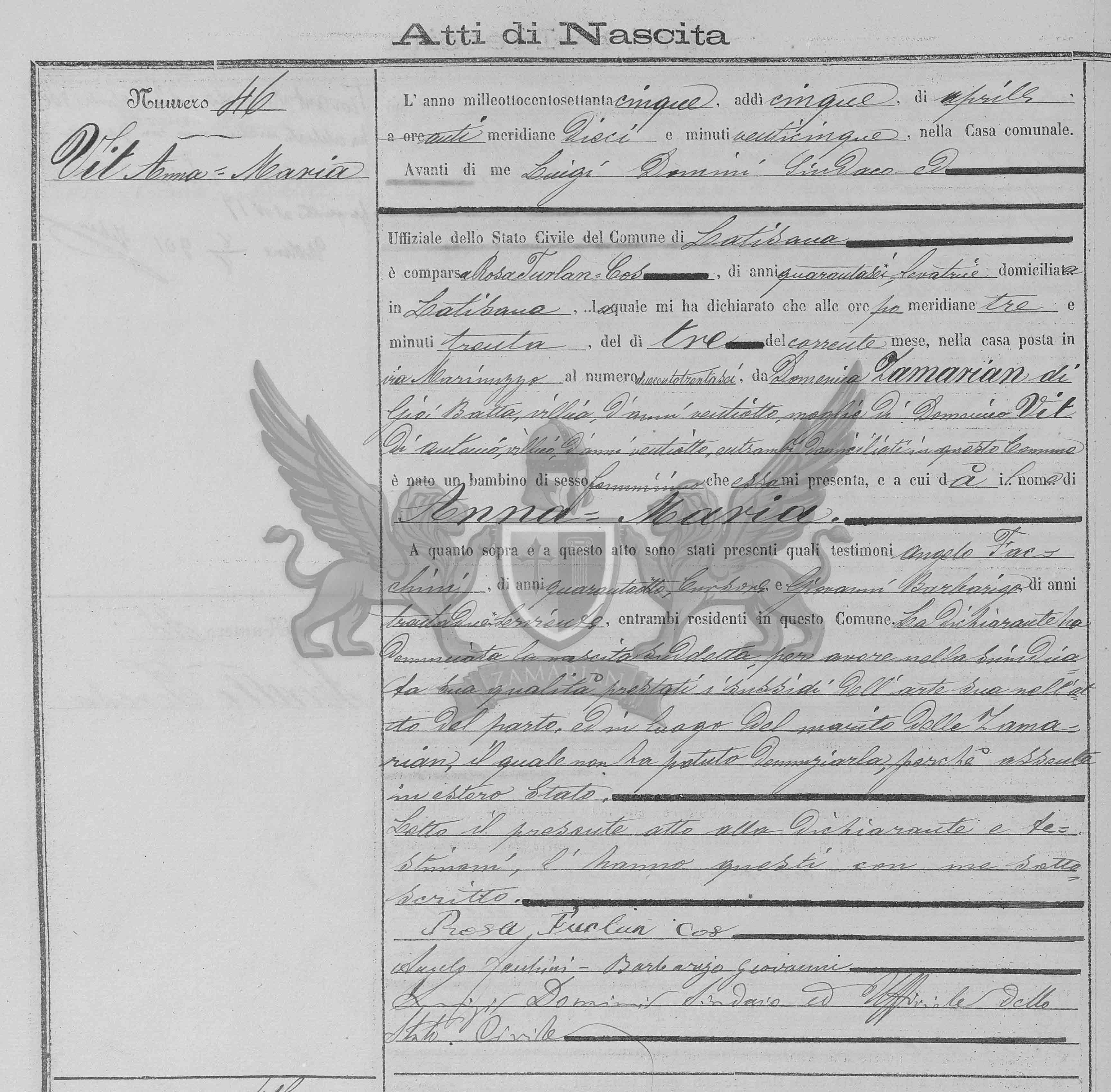 Diante de mim Luigi Domini Síndico Oficial do Registro Civil do Município de Latisana, compareceu Rosa Furlan Cos, de quarenta e seis anos, parteira, domiciliado em Latisana, a qual me declarou que às pós meridiana três horas e trinta minutos, do dia três do mês, na casa situada em via Marinuzzo ao número duzentos e trinta e seis, (Filha) de Domenica Zamarian (filha) de Giovanni Battista, camponesa, de vinte e oito anos, mulher de Domenico Vit (filho) de Antonio, camponês, de vinte e oito anos, ambos domiciliados neste município nasceu uma criança de sexo feminino que essa me apresenta, e a qual dá o nome de Anna Maria.