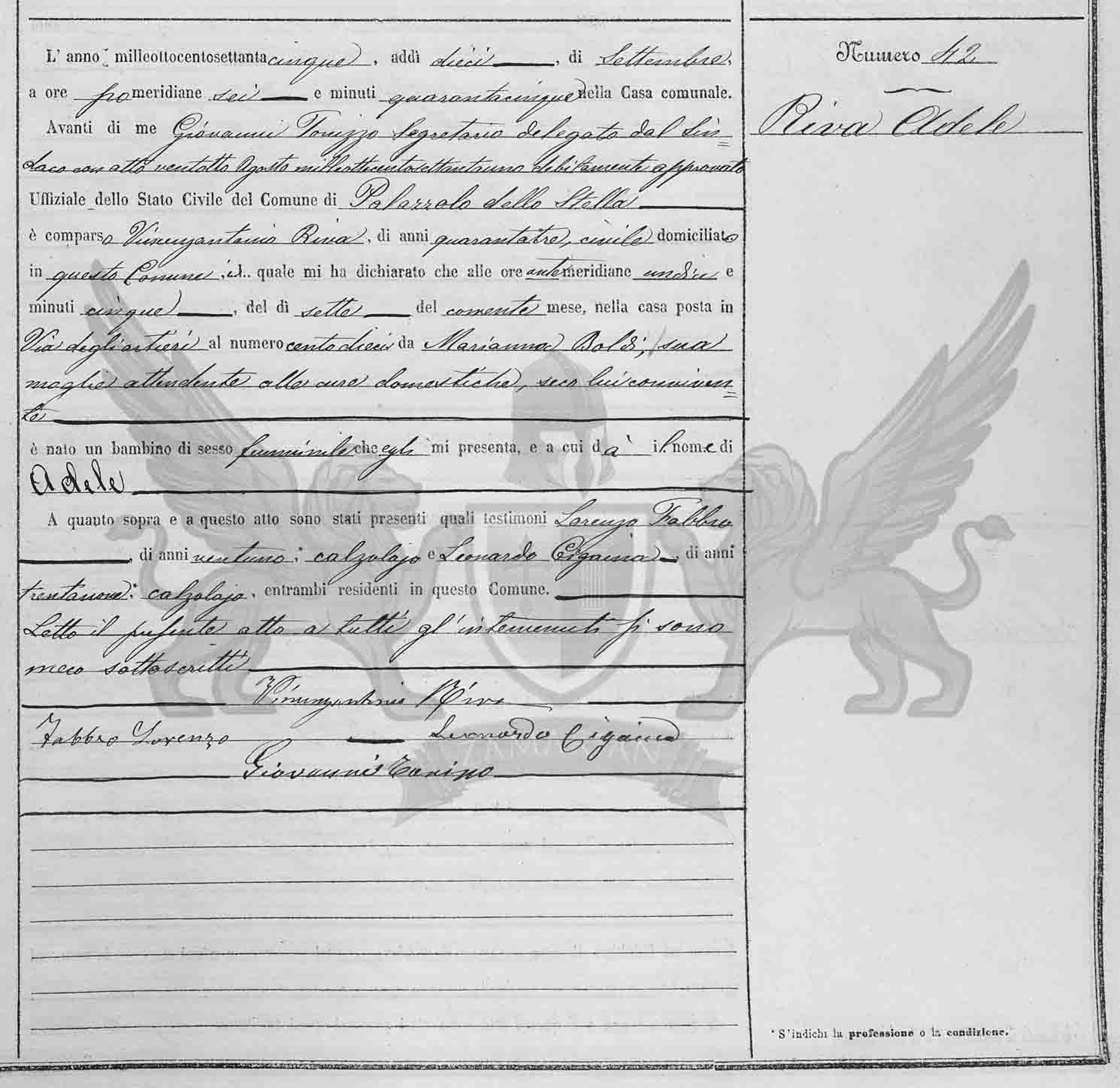 Diante de mim Giovanni Tonizzo Secretário delegado pelo Síndico com ato vinte e oito de Agosto de mil oitocentos e setenta e um devidamente aprovado Oficial do Registro Civil do Município de Palazzolo dello Stella, compareceu Vincenzantonio Riva, de quarenta e três anos, comerciante, domiciliado neste município, o qual me declarou que às ante meridiana onze horas e cinco minutos, do dia sete do corrente mês, na casa situada em via degli Artieri ao número cento e dez, (Filha) de Marianna Boldi; sua mulher atendendo aos cuidados domésticos, com ele convivente, nasceu uma criança de sexo feminino que essa me apresenta, e a qual dá o nome de Adele.