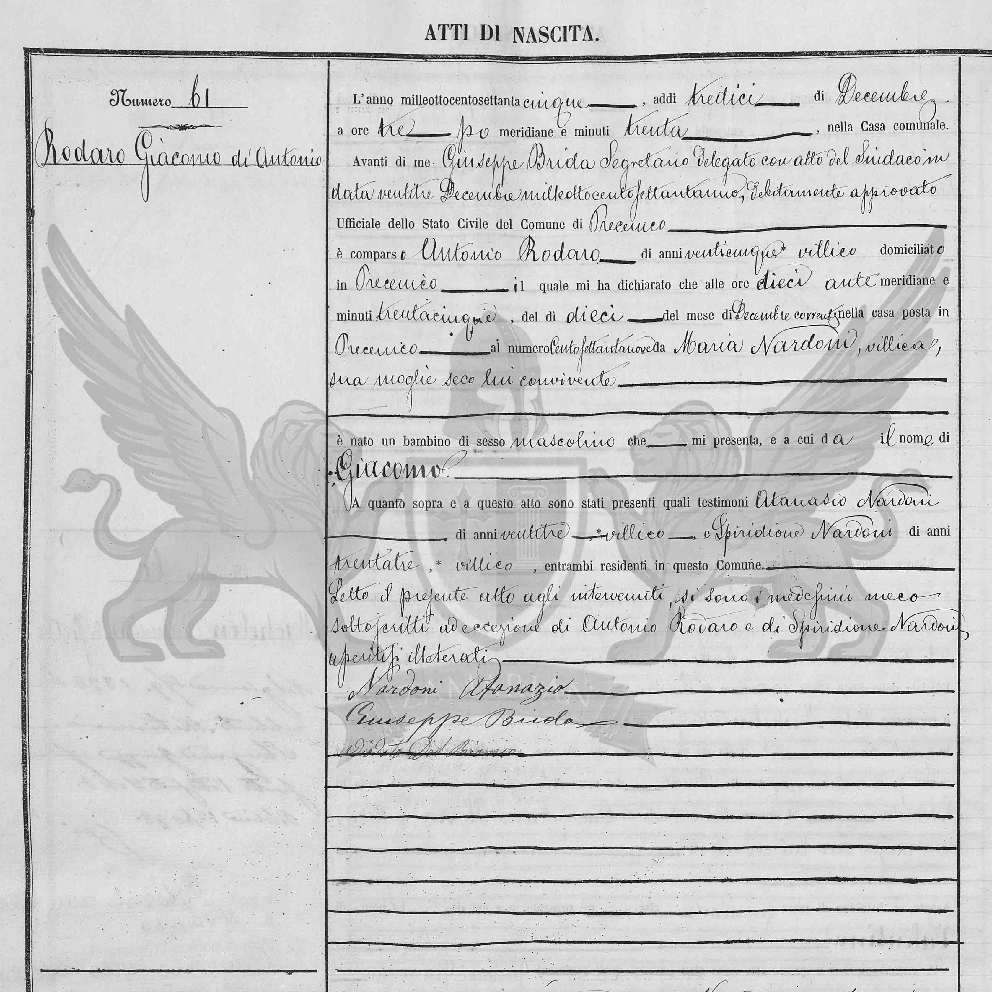 Diante de mim Giuseppe Brida secretário delegado com ato do Síndico em data vinte e três de dezembro de mil oitocentos e setenta e um devidamente aprovado Oficial do Registro Civil do Município de Precenicco, compareceu Antonio Rodaro, de vinte e cinco anos, camponês, domiciliado neste Município, o qual me declarou que às anti-meridiana dez horas e trinta e cinco minutos da noite, do dia dez do mês de dezembro corrente, na casa situada em Precenicco ao número cento e setenta e nove, de Maria Nardoni, camponesa, sua mulher, com ele convivente nasceu uma criança de sexo masculino que me apresenta, e ao qual dá o nome de Giacomo.