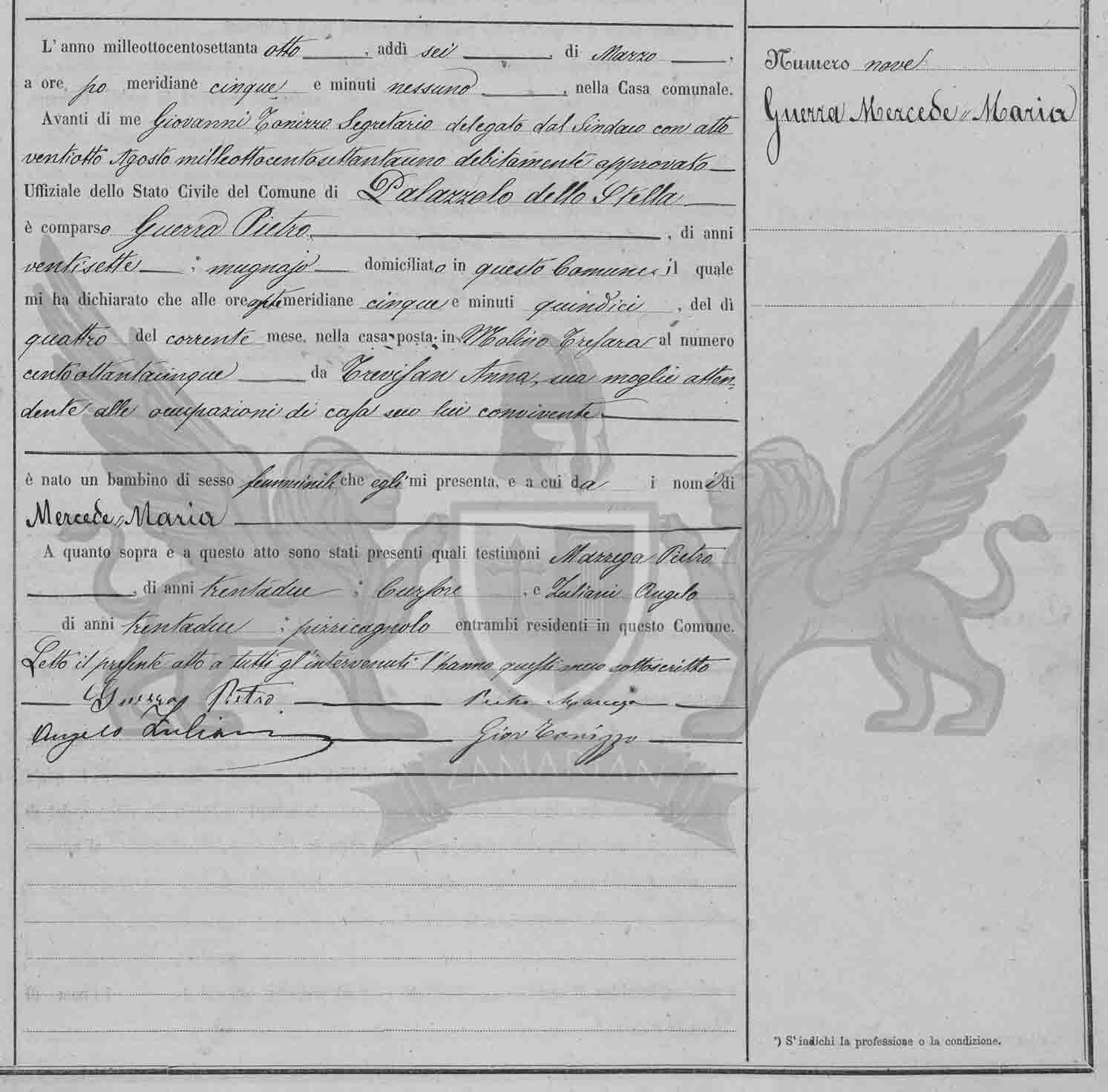 Diante de mim Giovanni Tonizzo Secretário Delegado pelo Síndico com ato em data vinte e oito de Agosto de mil oitocentos e oitenta e um devidamente aprovado, Oficial do Estado Civil do Município de Palazzolo dello Stella, compareceu Guerra Pietro, de vinte e sete anos, moedor, domiciliado neste Município, o qual me declarou que as ante meridiana cinco horas, do dia quatro, do corrente mês, na casa situada em Molino Tresara ao número oitenta e cinco, de Trevisan Anna, sua mulher atendente às ocupações com ele convivente, nasceu uma criança do sexo feminino que ele me apresenta, e a qual da o nome de Mercede Maria.