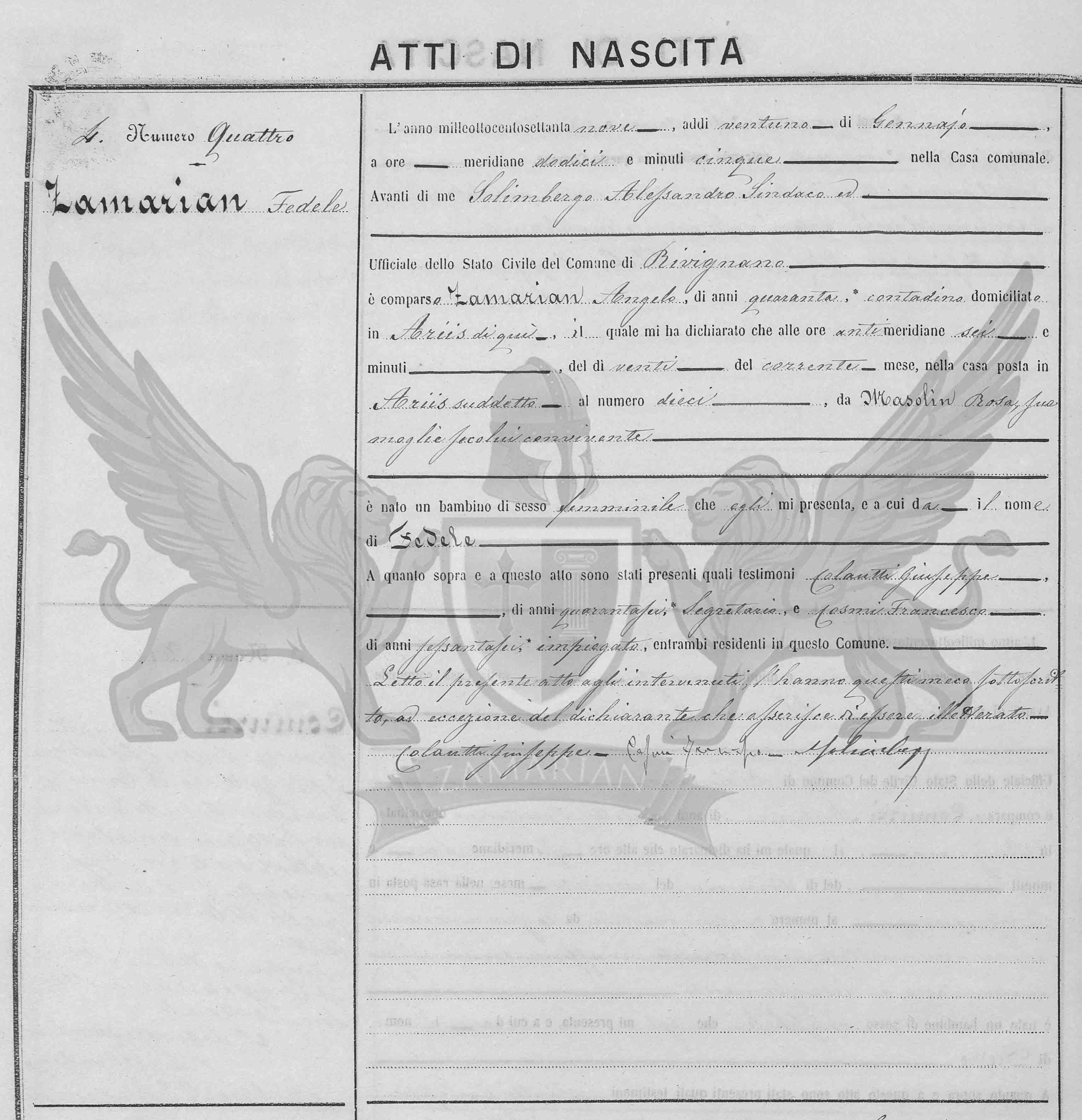 Diante de mim Solimbergo Alessandro Síndico e Oficial do Estado Civil do Município de Precenicco, compareceu Zamarian Angelo, de quarenta anos, *camponês, domiciliado em Ariis daqui, o qual me declarou que às seis horas da manhã, do dia vinte do corrente mês, na casa situada em Ariis supracitada ao número dez, de Masolin Rosa, sua mulher, camponesa, com ele convivente nasceu uma criança de sexo feminino que ele me apresenta, e a qual dá o nome de Fedele.