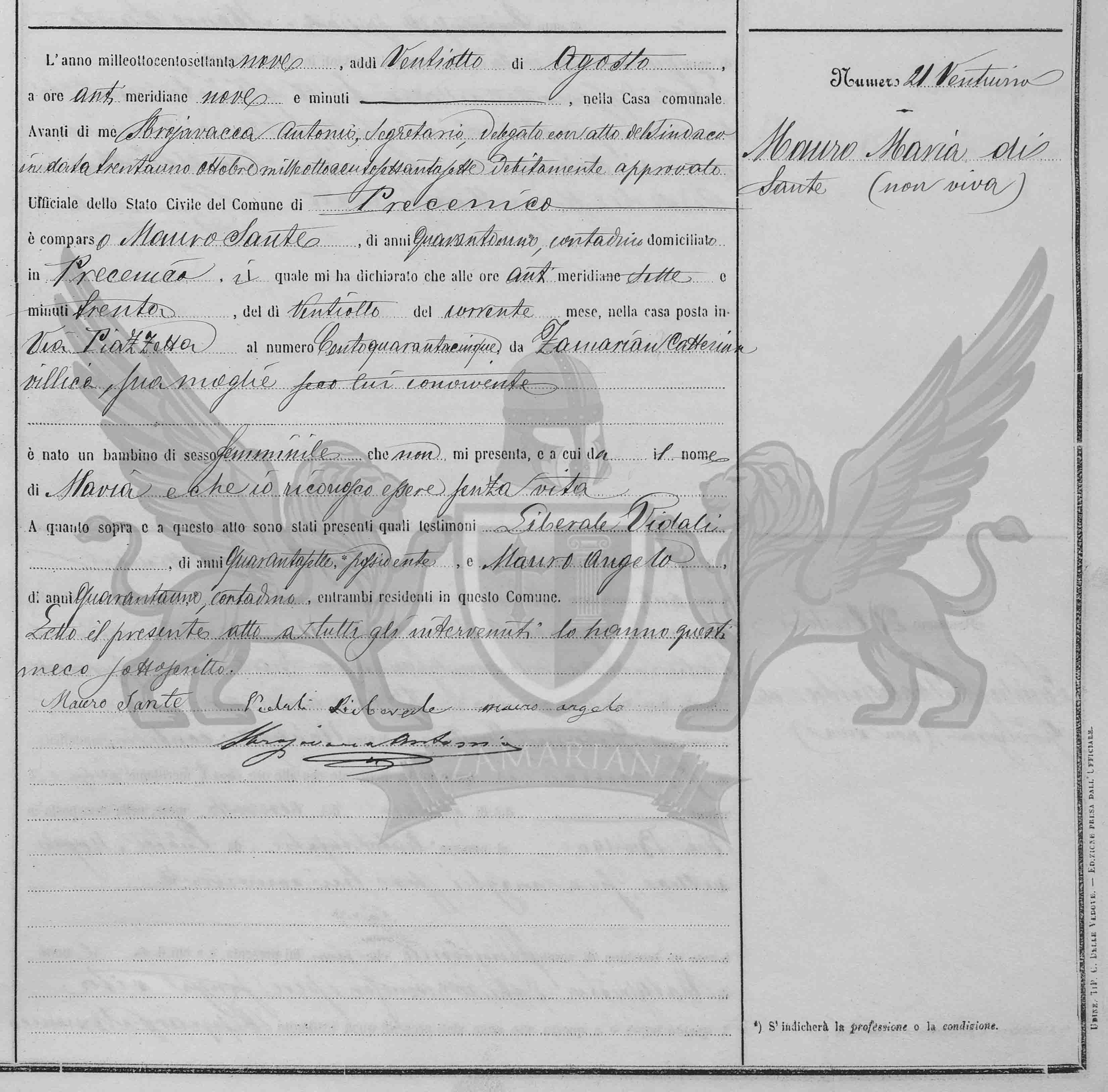 Diante de mim Srbajavacea Antonio secretário delegado pelo Síndico em data trinta e um de outubro de mil oitocentos e oitenta e sete devidamente aprovado Oficial do Estado Civil do Município de Precenicco, compareceu Mauro Sante, de quarenta e um anos, camponês, domiciliado em Precenicco, o qual me declarou que às sete horas e trinta minutos da manhã, do dia vinte e oito do corrente mês, na casa situada na Via Piazzetta ao número cento e quarenta e cinco, de Zamarian Caterina, camponesa, sua mulher, com ele convivente nasceu uma criança de sexo feminino que me não apresenta, e a qual dá o nome de Maria e que eu reconheço estar sem vida.