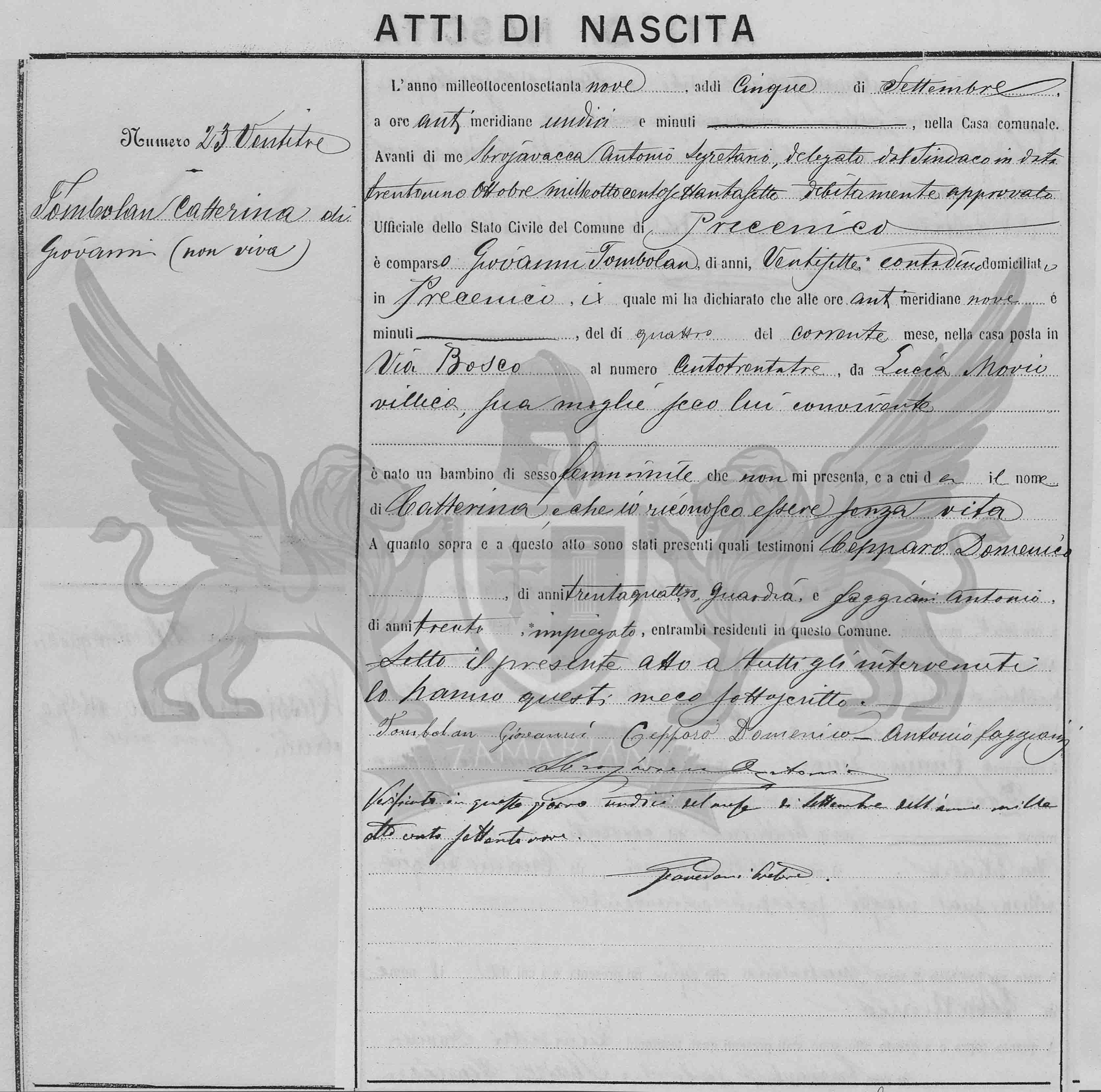 Diante de mim Srbajavacea Antonio secretário delegado pelo Síndico em data trinta e um de outubro de mil oitocentos e setenta e sete devidamente aprovado Oficial do Estado Civil do Município de Precenicco, compareceu Giovanni Tombolan, de vinte e seis anos, camponês, domiciliado em Precenicco, o qual me declarou que às ante meridiana nove horas, do dia quatro do corrente mês, na casa situada na Via Bosco ao número cento e trinta e três, de Lucia Movio, camponesa, sua mulher, com ele convivente nasceu uma criança de sexo feminino que me não apresenta, e a qual dá o nome de Catterina e que eu reconheço estar sem vida.