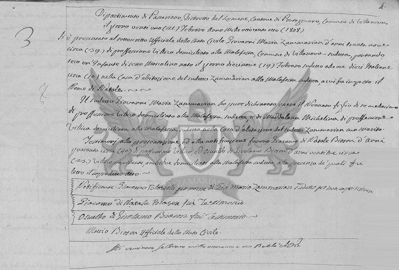Departamento de Passariano, Distrito de Lemene, Cantão de Portogruaro, Município de Villanova, dia vinte e um (21) de fevereiro de mil oitocentos e oito (1808)