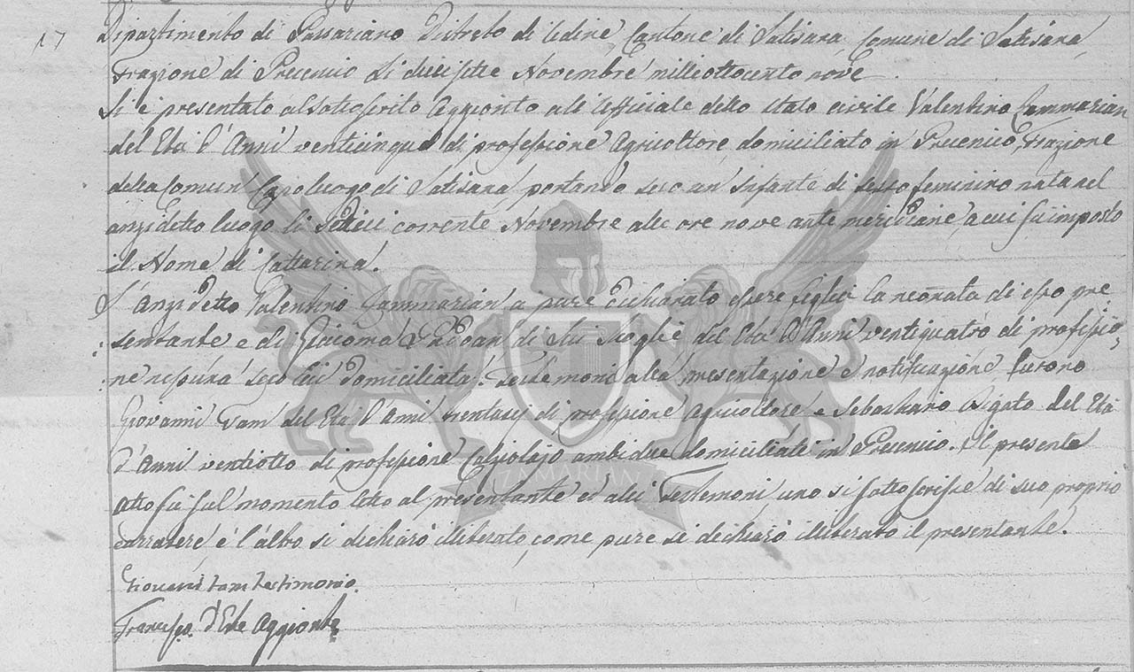 Se apresentou ao subscrito adjunto ao Oficial do Registro Civil Valentino Zammarian de vinte e cinco anos de idade de profissão agricultor domiciliado em Precenicco Fração do Município de Latisana, trazendo consigo um infante de sexo feminino nascida no lugar pré citado dia dezesseis de novembro corrente às nove horas da manhã à qual foi imposto o nome de Cattarina.