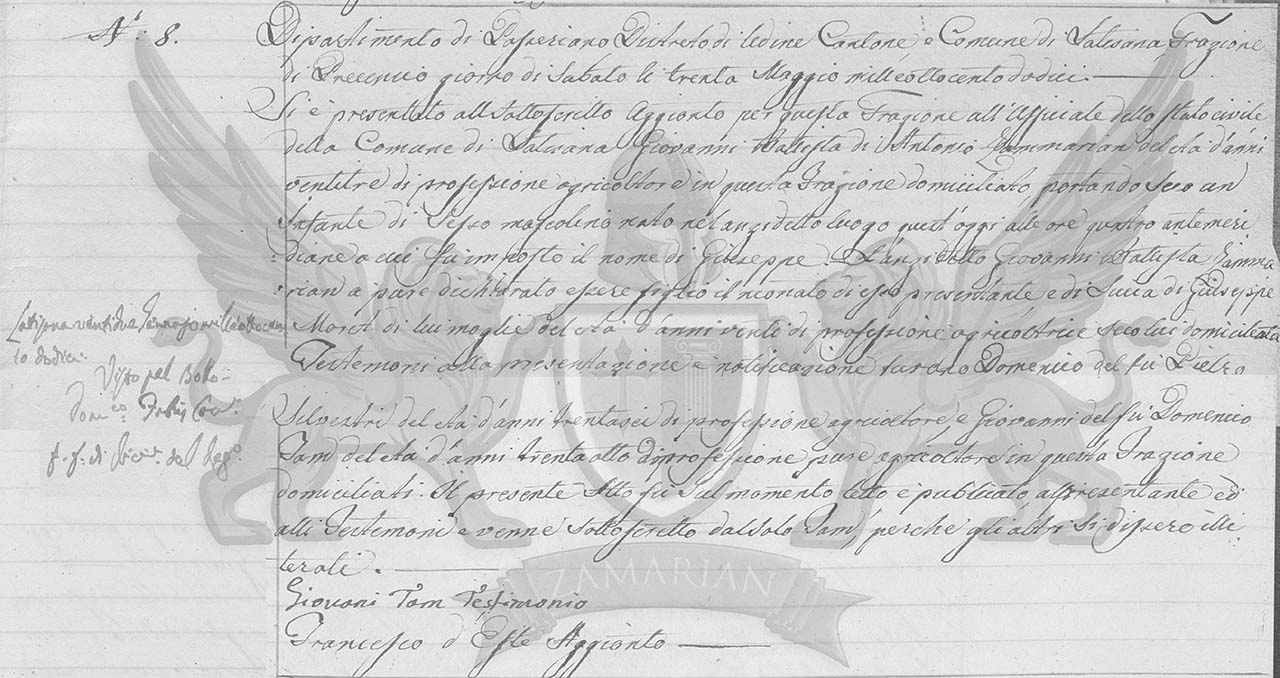 Se apresentou ao subscrito adjunto por esta Fração ao Oficial do Registro Civil do Município de Latisana Giovanni Battista filho de Antonio Zammarian de vinte e três anos de idade de profissão agricultor e nesta Fração domiciliado, portando consigo um infante de sexo masculino nascido no referido lugar hoje às quatro da manhã ao qual foi imposto o nome de Giuseppe.