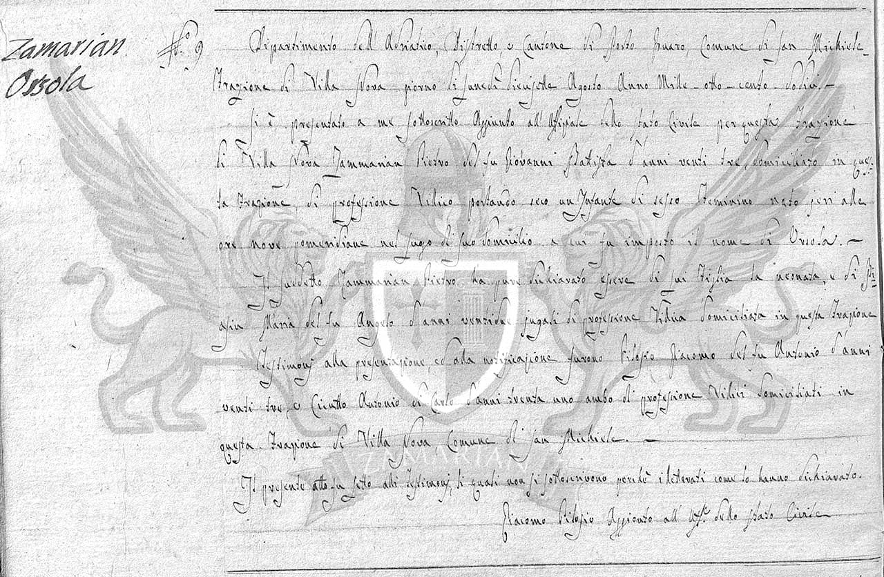 O supracitado Zammarian Pietro também declarou ser dele a filha neo nata, e de Biasin Maria filha do finado Angelo iguais de profissão camponesa domiciliada nesta Fração de Villanova Município de San Michele.