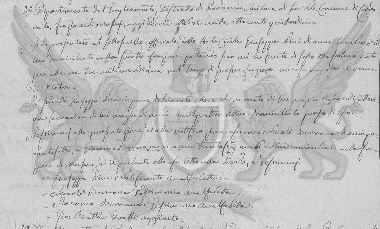 Se apresentou ao subscrito oficial do Registro Civil, Giuseppe Picci de trinta e um anos camponês, domiciliado na citada Fração portando consigo um infante de sexo masculino nascido ontem às três horas da manhã nesta Fração ao qual foi imposto o nome de Pietro.