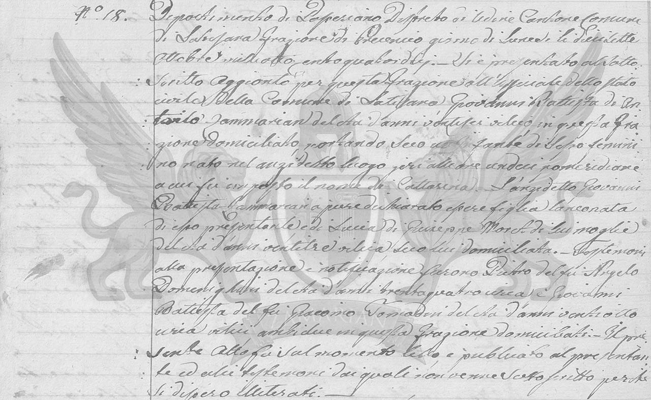Se apresentou ao subscrito Adjunto por esta Fração ao Oficial do Registro Civil do Município de Latisana Giovanni Battista filho de Antonio Zammarian de vinte e seis anos de idade, camponês nesta Fração domiciliado, portando consigo um infante de sexo feminino nascido no referido lugar ontem às onze horas da noite ao qual foi imposto o nome de Cattarina.
