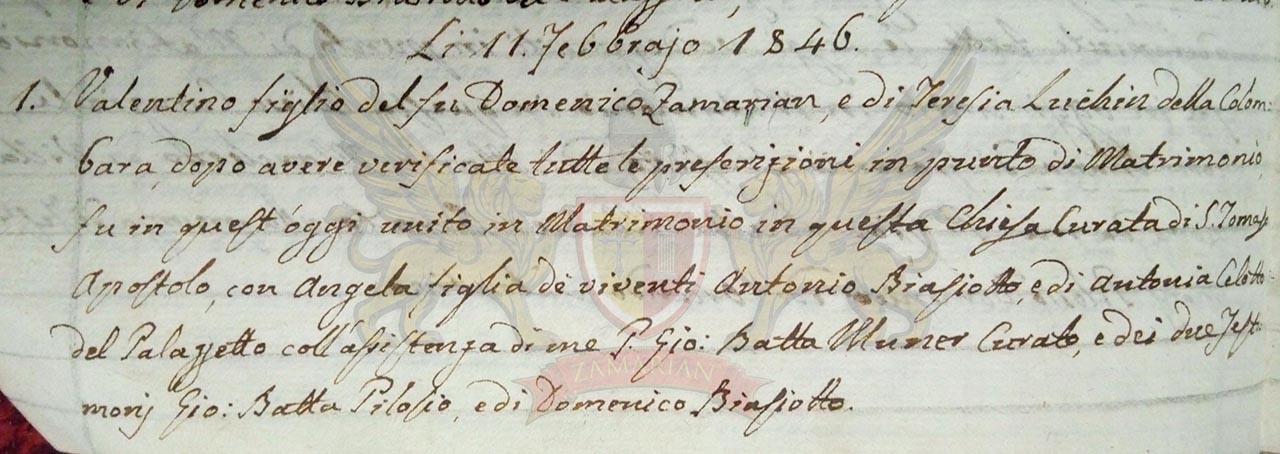 Valentino filho do finado Domenico Zamarian, e de Teresa Lucchin de Colombara, depois de ter verificado todos os procedimentos previstos de Matrimônio foi hoje unido em Matrimônio nesta Igreja Curada de San Tomaso Apostolo, com Angela filha dos viventes Antonio Biasiotto, e de Antonia Celotto de Palazzetto com a assistência minha P. Giovanni Battista Wuner Curado, e das duas Testemunhas Giovanni Battista Pilosio, e de Domenico Biasiotto.